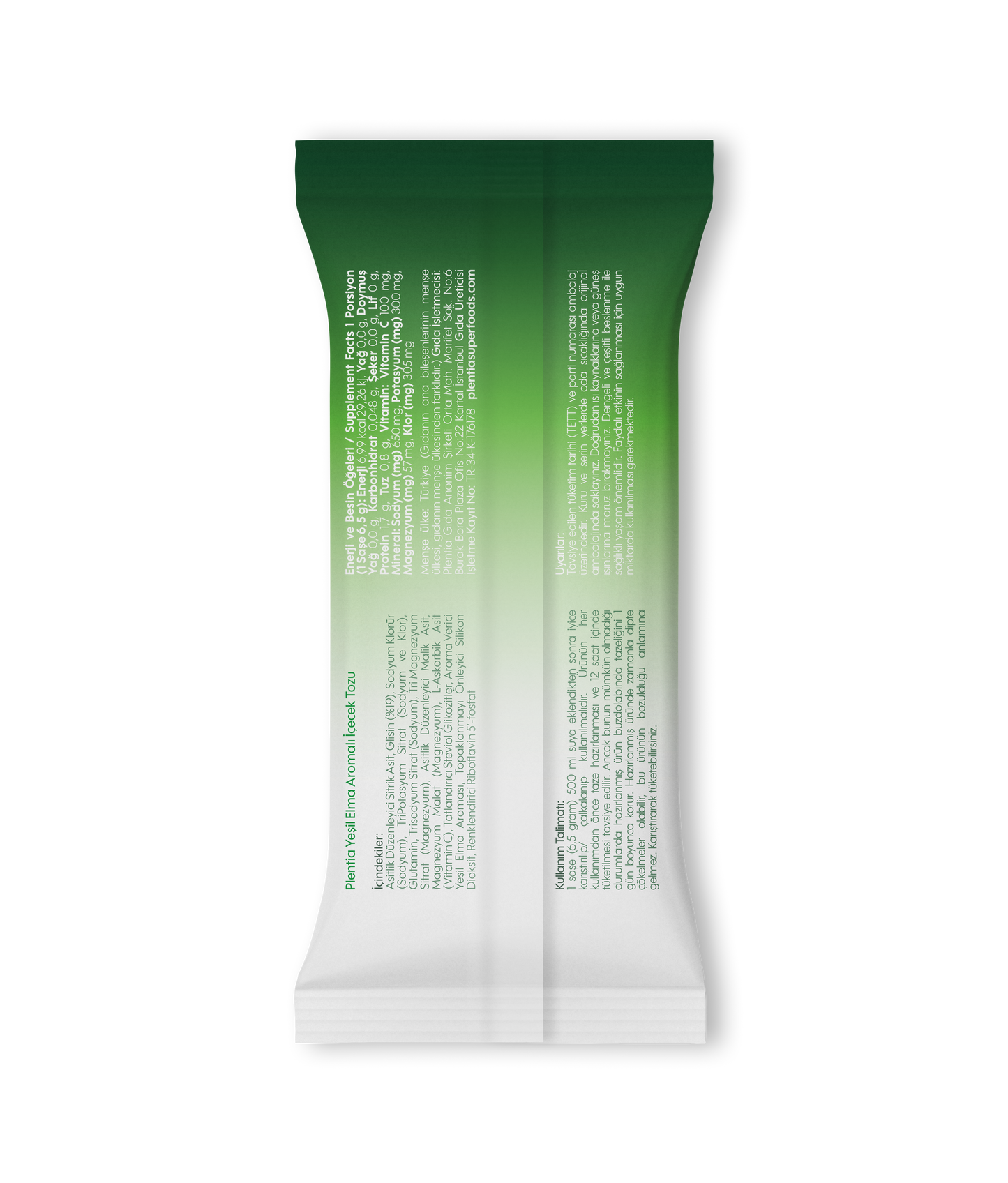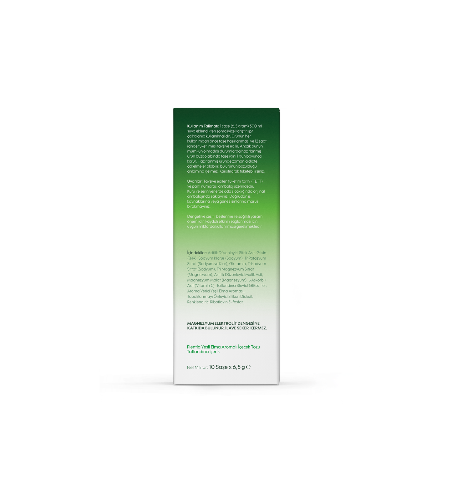 Asitlik Düzenleyici Sitrik Asit, Glisin, Sodyum Klorür (Sodyum), TriPotasyum Sitrat (Sodyum ve Klor), Glutamin, Trisodyum Sitrat (Sodyum), Tri Magnezyum Sitrat (Magnezyum), Asitlik Düzenleyici Malik Asit, Magnezyum Malat (Magnezyum), L-Askorbik Asit (Vitamin C), Tatlandırıcı Steviol Glikozitler, Aroma Verici Yeşil Elma Aroması, Topaklanmayı Önleyici Silikon Dioksit, Aroma Verici Yeşil Elma Aroması, Renklendirici Riboflavin 5’-fosfat